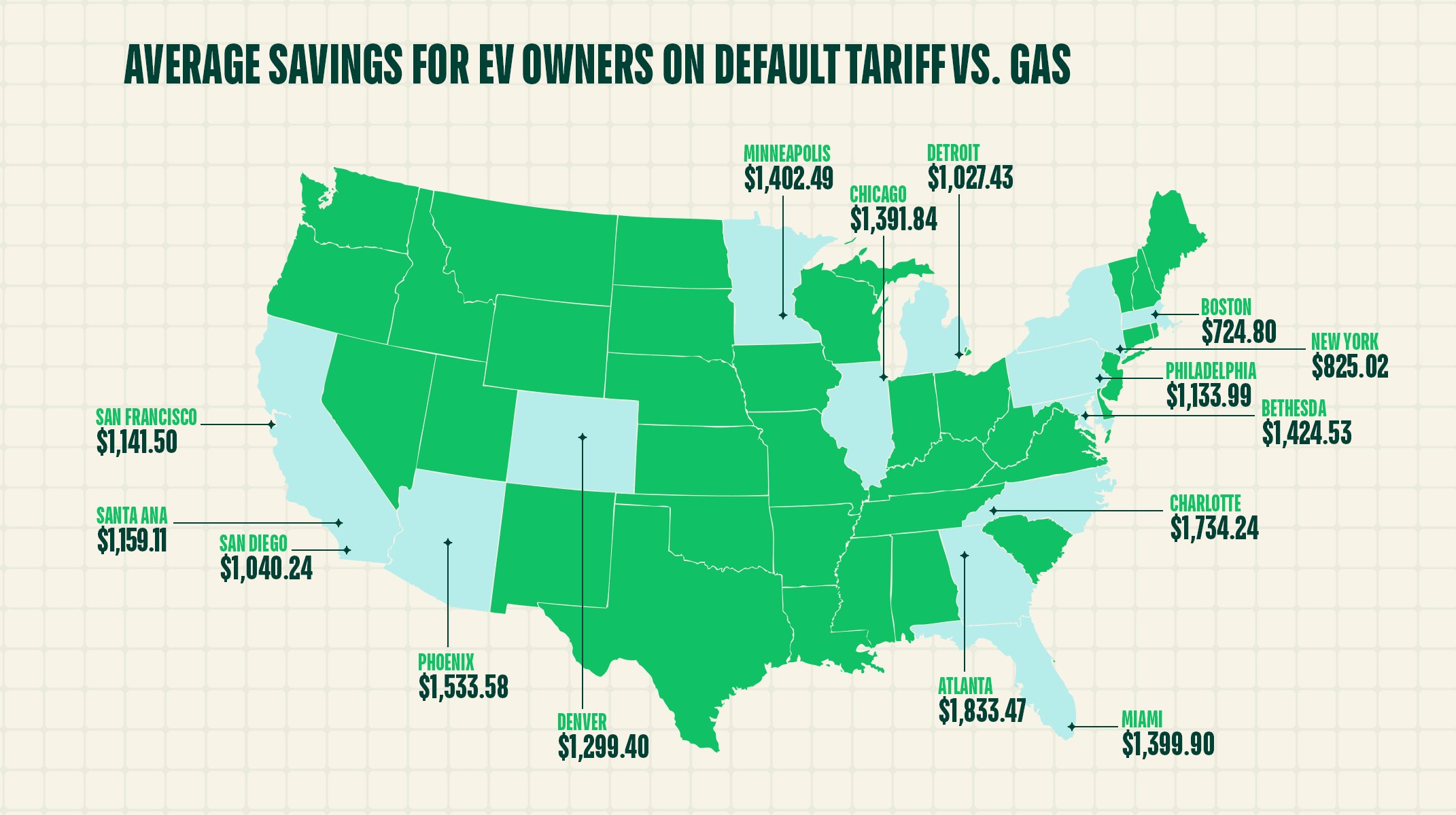 Like with electricity costs, the savings vary across metro areas. San Diego has the highest EV charging costs at $1,239 for the year, but it also has high gas costs. EV owners can save 46%, or more than $1,000 annually, on the default tariff. Charlotte, North Carolina has the highest potential savings at 76% less than fuel costs. Even in Boston, the metro area with the lowest percentage savings at 40%, savings from EV charging amount to more than $700.